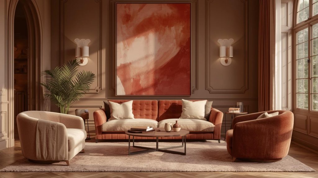 Rich cacao brown paired with dusty or soft pinks creates a palette that is both warm and incredibly chic. This sophisticated combination feels luxurious and inviting. Use cacao for grounding elements like flooring or furniture, while soft pink tones can soften the space on walls or through plush textiles.