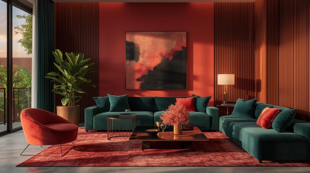 To make a confident statement, combine the vibrant energy of sunset coral with the rich depth of deep teal. This high-contrast pairing is perfect for creating a focal point. Use teal on an accent wall or a statement piece of furniture, and introduce coral through smaller decorative elements for a burst of warmth and personality.